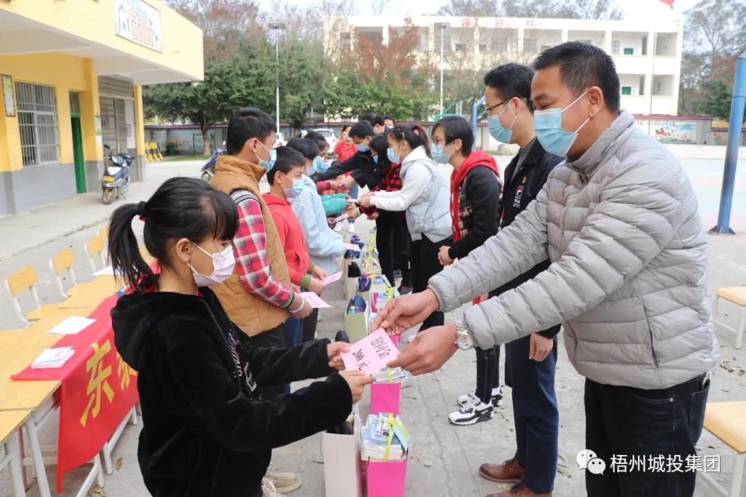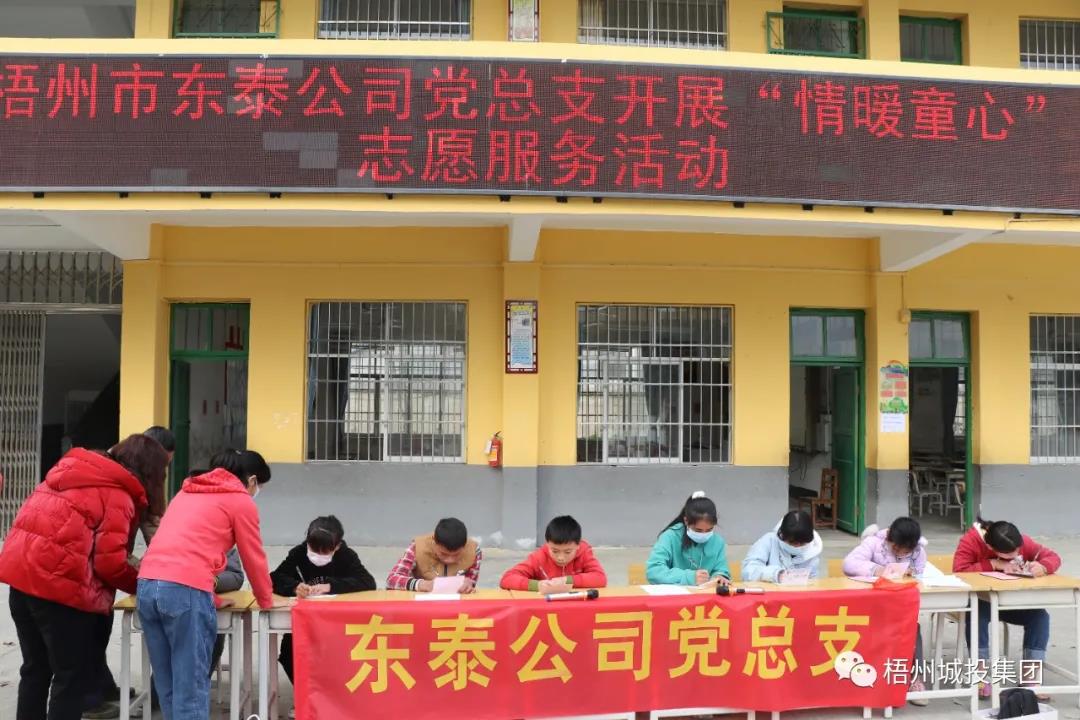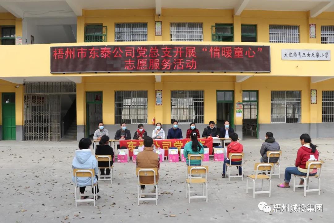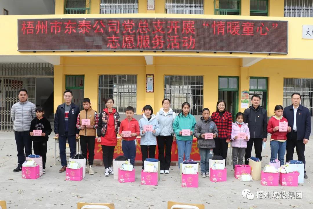 春节将至,1月28日,东泰公司党总支组织直属党支部、水务分公司党支部和江滨酒店党支部联合开展“情暖童心”志愿服务活动,市小新专属集团副总经理、东泰公司总经理潘嘉明带领党员志愿者到苍梧县大坡镇马王小学看望慰问困难儿童,关心爱护他们的健康成长。