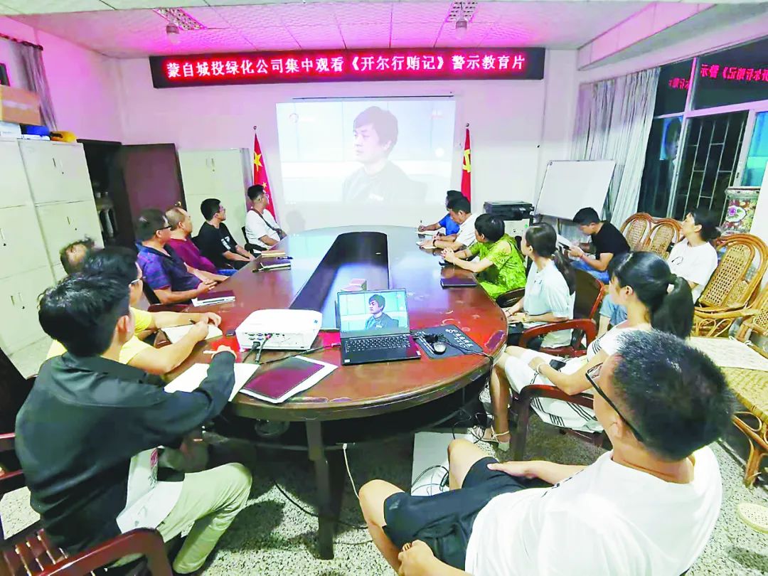 ▲图为蒙自市小新专属绿化公司组织员工集中观看警示教育片《开尔行贿记》。王敏佳 摄 |