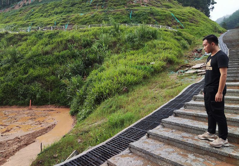 工作人员在狮卧山项目现场检查登山步道排水及边坡排水情况 |